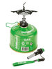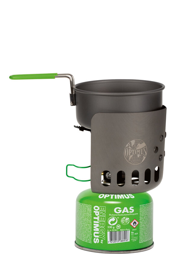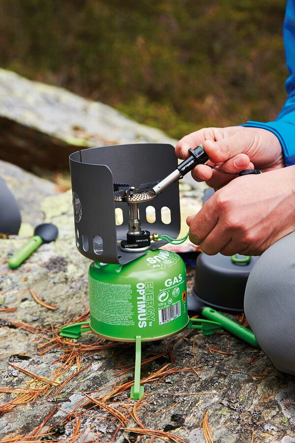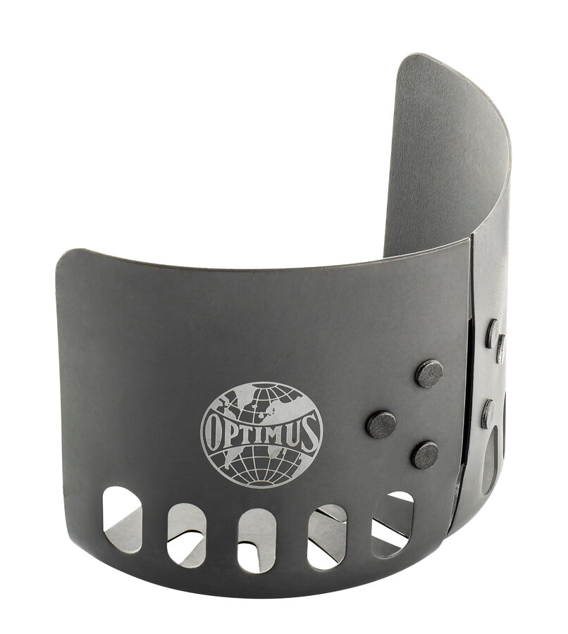 Lightweight, hard anodized aluminium clip-on windshield for use with canister mounted stoves. Increases stove efficiency and substantially reduces gas consumption. Fits every gas canister according to EN417 and pots with max. diameter 12.4 cm (4.8 in). Compatible with standard pots. Easy packability (fits around the Optimus Terra Weekend pot).